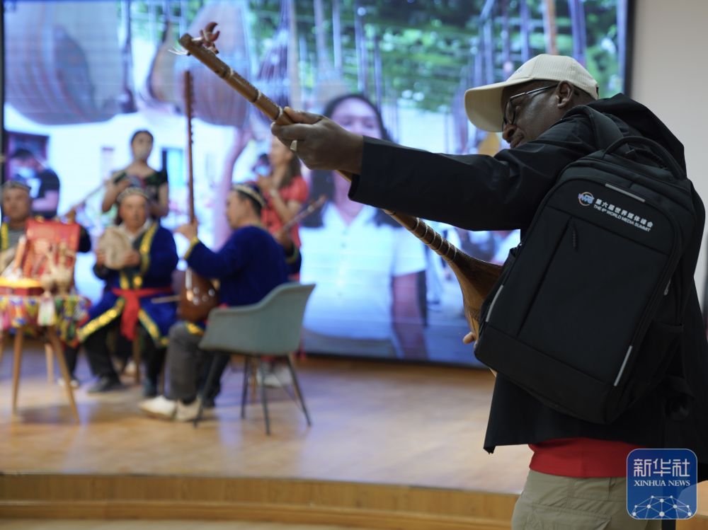 10月15日,與會嘉賓在阿克蘇地區(qū)新和縣加依村龜茲文化樂器展示中心與演員互動。