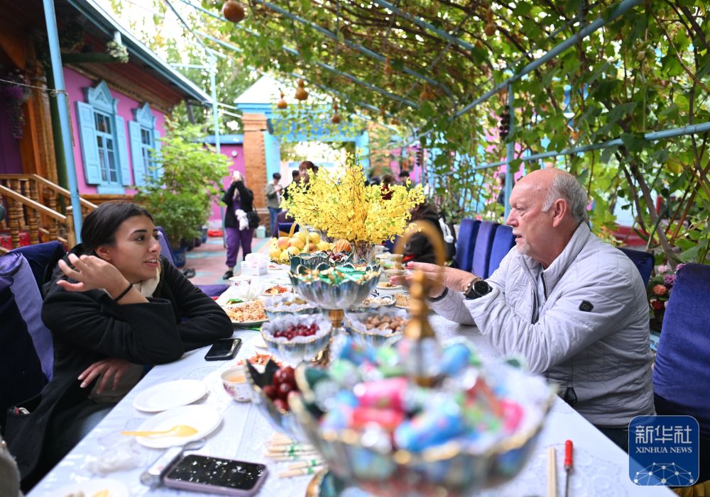 10月15日,與會嘉賓在伊寧市喀贊其民俗旅游區(qū)與表演者互動。