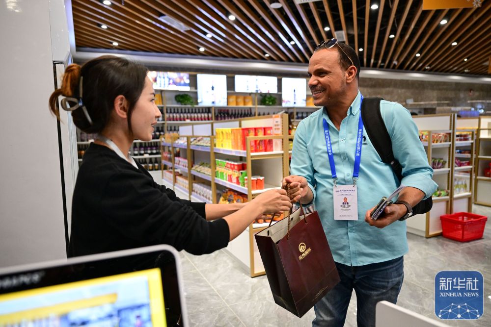 10月15日,與會嘉賓在新疆喀什跨境電商進出口商品展示交易中心購買紀念品。