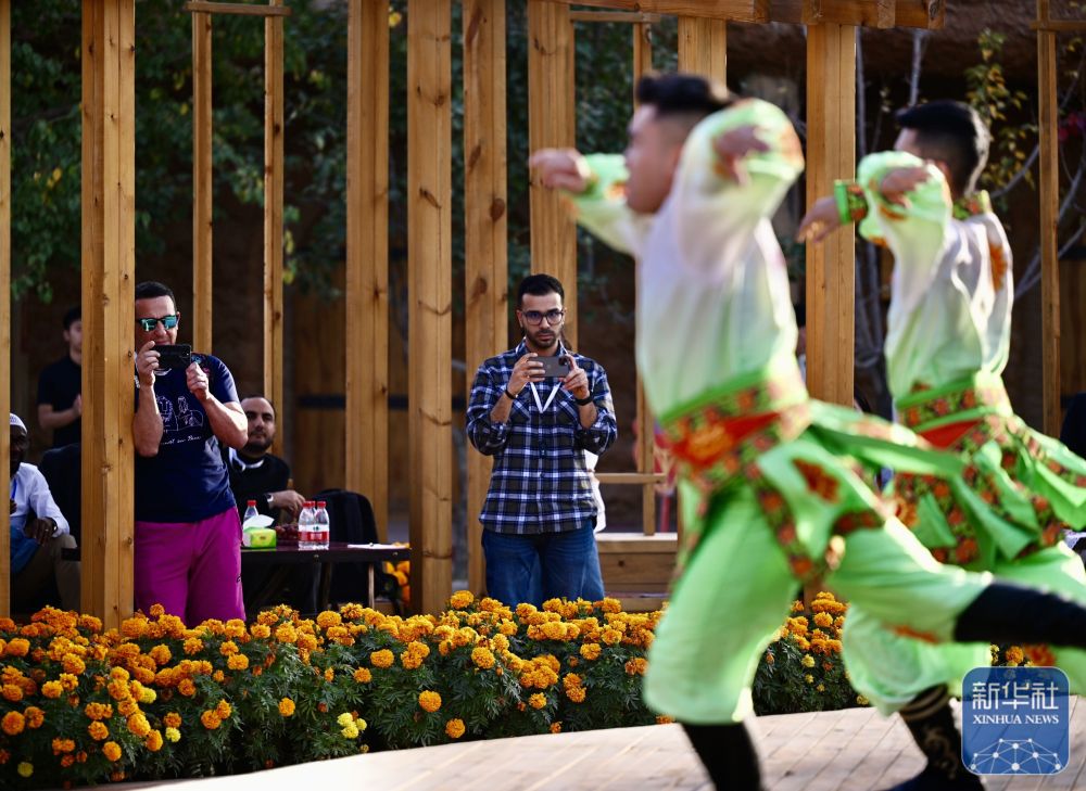 10月15日,與會嘉賓在阿克蘇地區(qū)新和縣加依村龜茲文化樂器展示中心欣賞舞蹈表演。