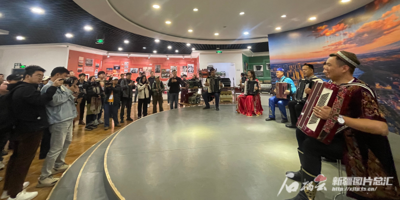 10月15日下午,參加第六屆世界媒體峰會的外媒代表觀看手風琴表演。石榴云/新疆日報記者 郭玲 攝