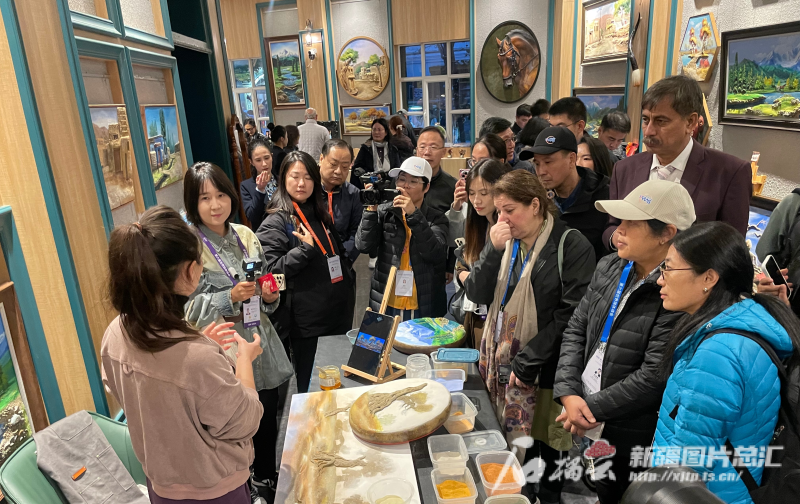 10月15日下午,參加第六屆世界媒體峰會的外媒代表聽沙石畫的“故事”。石榴云/新疆日報記者 郭玲 攝