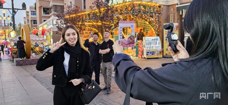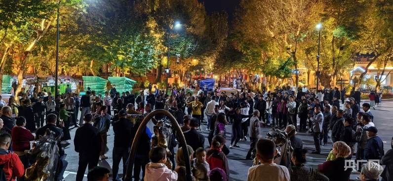 除了庫(kù)爾德寧的自然景觀,伊寧市六星街、喀贊其文化旅游區(qū)也深得旅游博主吳思瑤的青睞。夜晚的六星街,當(dāng)歡快的音樂(lè)響起,各族群眾不約而同地跳了起來(lái),看到這一幕,吳思瑤迫不及待地沖向前:“啊,我要拍……”