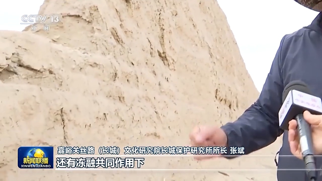 嘉峪關(guān)絲路(長城)文化研究院長城保護(hù)研究所所長 張斌:這塊就是風(fēng)雪,還有凍融共同作用下,形成一個很深的掏蝕凹槽,可能掏蝕進(jìn)去20多公分,所以我們通過對它進(jìn)行日常維護(hù),就是對它進(jìn)行夯補,它這個墻體的穩(wěn)定性就好了。