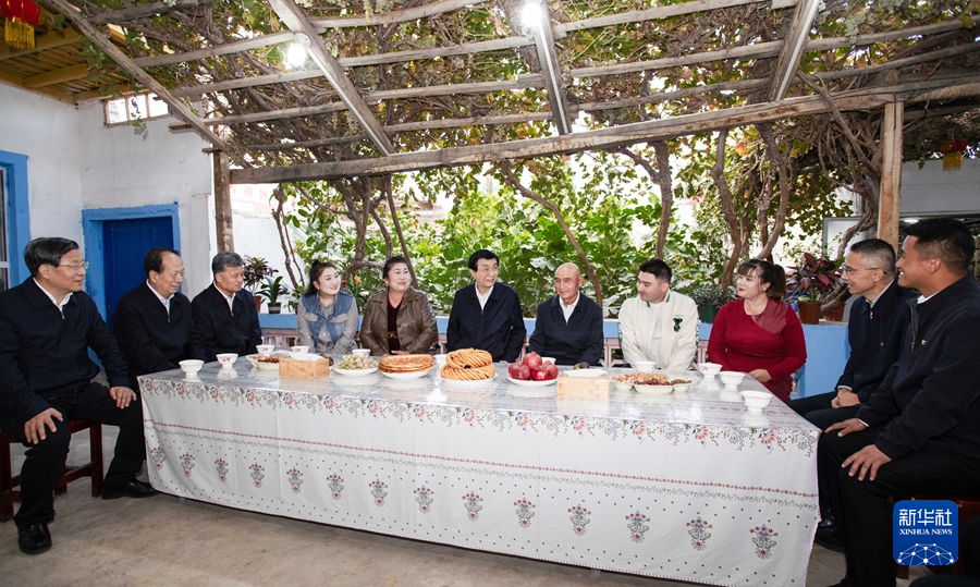 10月21日至24日,中共中央政治局常委、全國(guó)政協(xié)主席王滬寧在新疆和田、喀什調(diào)研。這是23日下午,王滬寧在疏勒縣塔孜洪鄉(xiāng)臺(tái)吐爾村同干部群眾交流。新華社記者 李濤 攝
