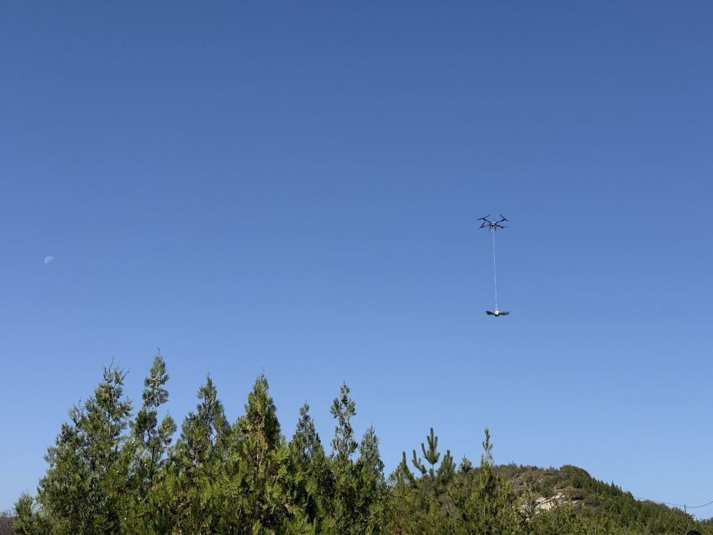 “懸崖造林隊(duì)”隊(duì)員在操作無(wú)人機(jī),將樹(shù)苗運(yùn)到另一側(cè)山頭。