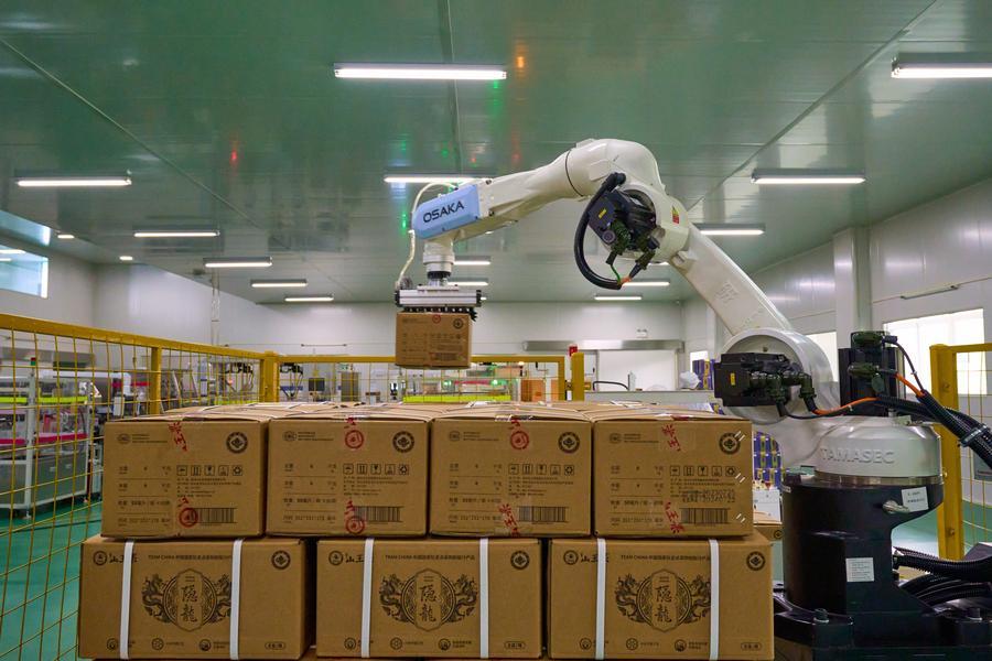貴州山王果健康實業(yè)有限公司5G智慧工廠全自動包裝線正在工作。(新華社發(fā))