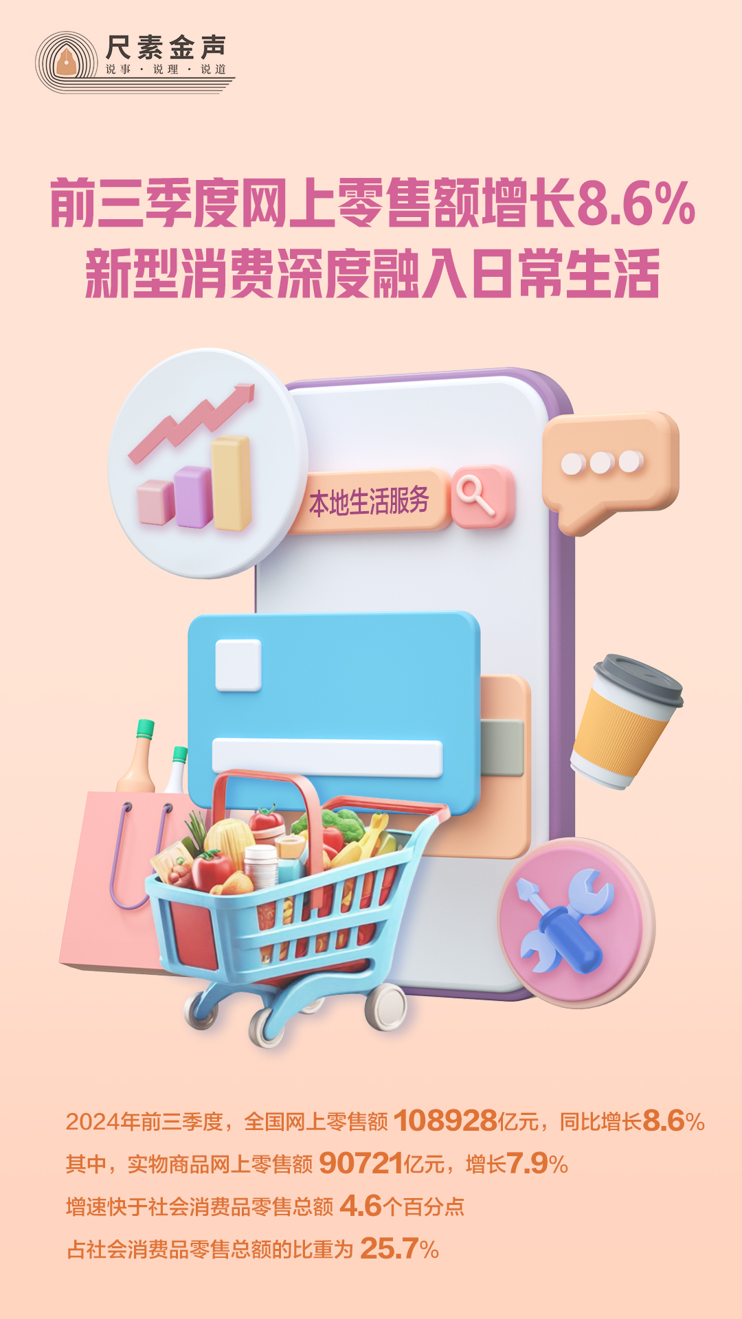 最新數(shù)據(jù)顯示,今年前三季度,全國網(wǎng)上零售額108928億元,同比增長8.6%。其中,實物商品網(wǎng)上零售額90721億元,增長7.9%,增速快于社會消費品零售總額4.6個百分點,占社會消費品零售總額的比重為25.7%。本地生活服務等新型消費快速增長,對線上消費增長起到明顯的拉動作用。