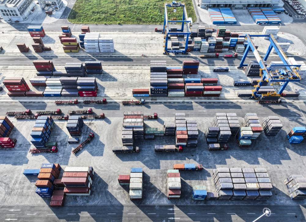 10月28日,轉(zhuǎn)運(yùn)卡車在陸海新通道重慶無水港來往穿梭(無人機(jī)照片)。