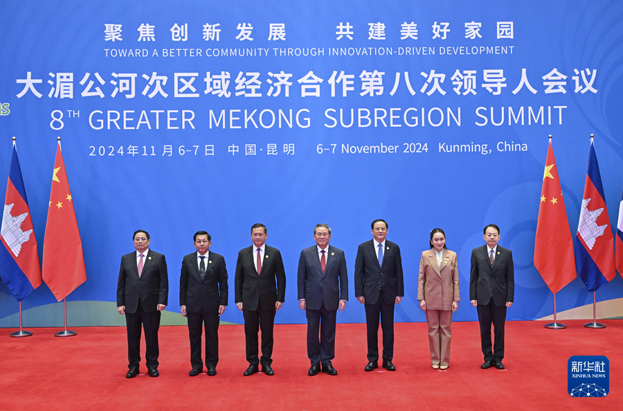 11月7日,國(guó)務(wù)院總理李強(qiáng)在昆明出席大湄公河次區(qū)域經(jīng)濟(jì)合作第八次領(lǐng)導(dǎo)人會(huì)議。這是李強(qiáng)同出席會(huì)議的柬埔寨、老撾、緬甸、泰國(guó)、越南政府首腦和亞洲開(kāi)發(fā)銀行行長(zhǎng)合影。新華社記者 殷博古 攝