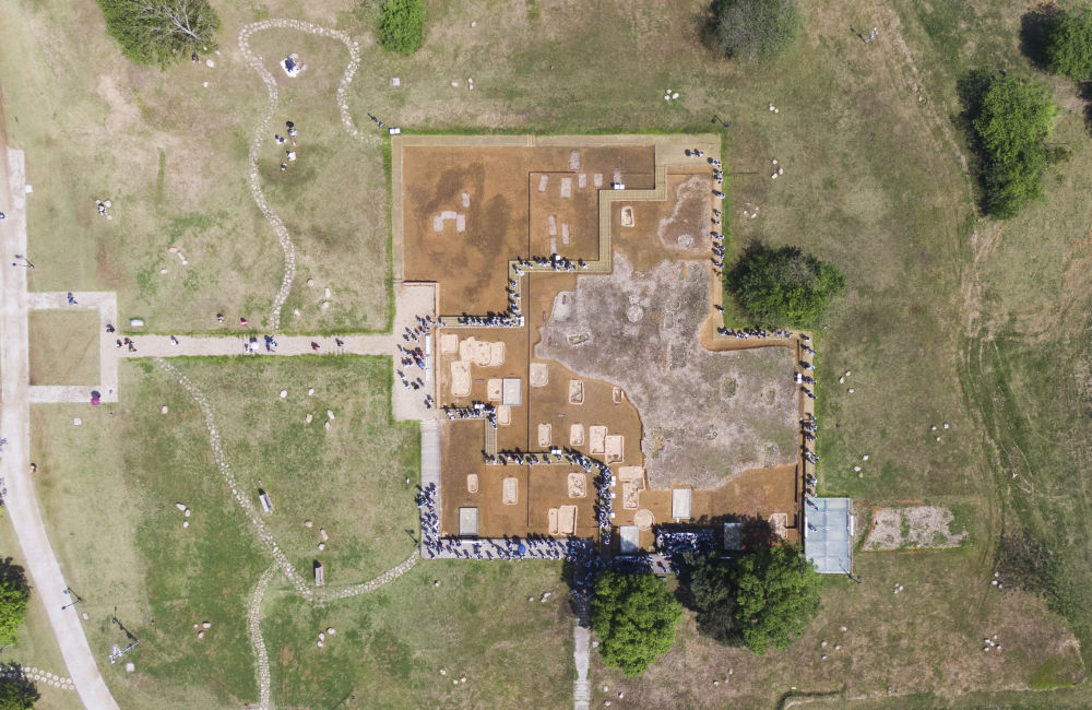 這是2024年4月18日拍攝的位于安徽省馬鞍山市含山縣境內(nèi)的凌家灘國家考古遺址公園墓葬祭祀?yún)^(qū)(無人機照片)。新華社記者 傅天 攝
