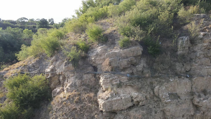 為防止碎石脫落將古棧道掩埋或毀壞,近幾年國家出資對此處棧道上的危巖體進行加固。目前工程已竣工,古棧道上方有專業(yè)防護網(wǎng),新修的排水溝阻斷了上方雨水對古棧道的沖刷。
