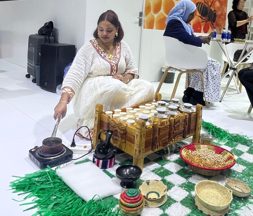 在埃塞俄比亞國家館展區(qū),埃塞俄比亞咖啡師在現(xiàn)場烘焙咖啡豆,展示當(dāng)?shù)乜Х任幕?。(受訪者供圖)