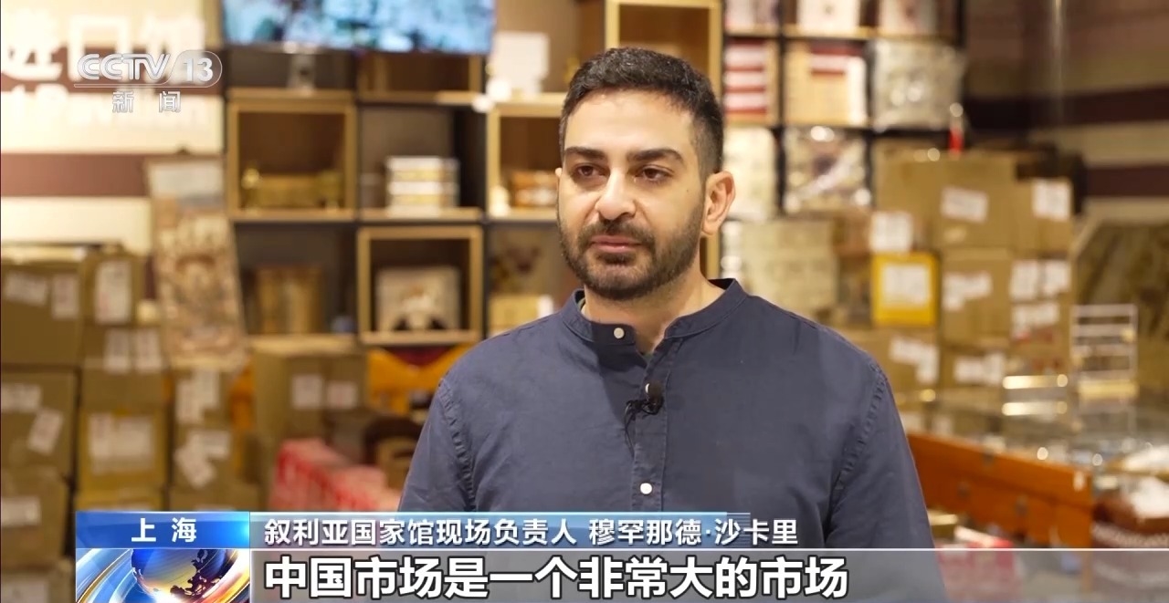 敘利亞國(guó)家館現(xiàn)場(chǎng)負(fù)責(zé)人 穆罕那德·沙卡里:中國(guó)市場(chǎng)是一個(gè)非常大的市場(chǎng),我們團(tuán)隊(duì)決定,必須要有人成為中國(guó)市場(chǎng)和敘利亞市場(chǎng)之間的橋梁,看中國(guó)消費(fèi)者是否喜歡我們的產(chǎn)品,我們需要做什么調(diào)整來滿足中國(guó)消費(fèi)者的需求。