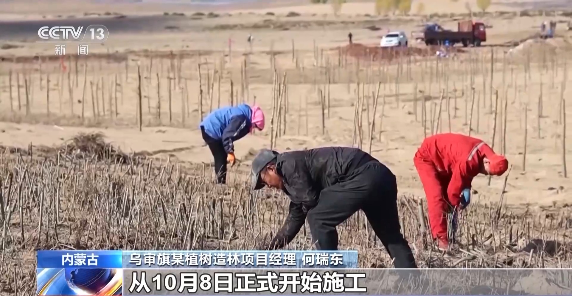 烏審旗某植樹(shù)造林項(xiàng)目經(jīng)理 何瑞東:挖樹(shù)坑嚴(yán)格保證至少在1米,保證種植深度,及時(shí)澆水,保證每棵樹(shù)都要種到位、澆到位。從10月8日正式開(kāi)始施工,總占地治理面積是3225畝。
