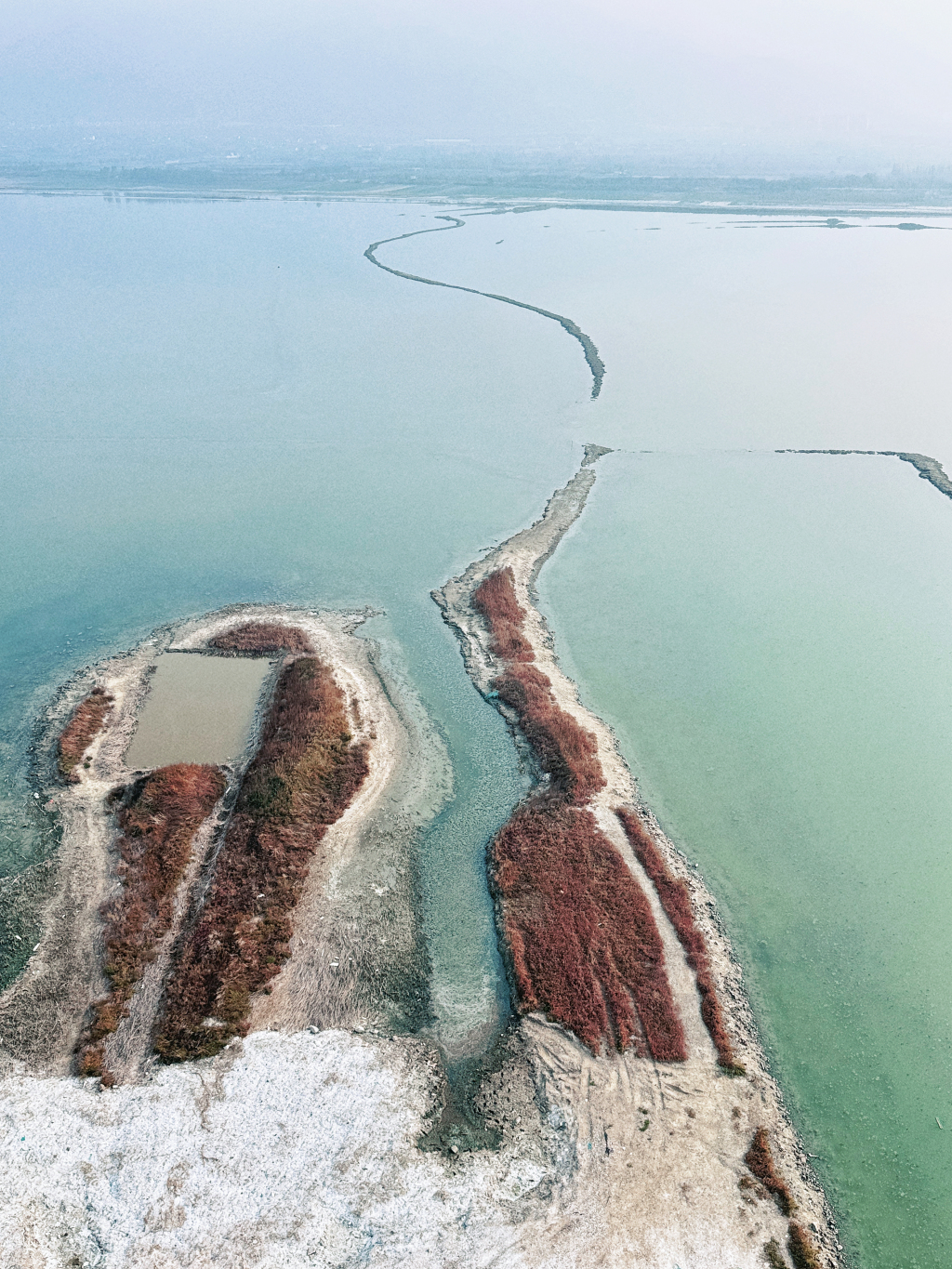 這個面積約132平方公里的湖泊,位于運(yùn)城盆地的盆底,是山西省最大的湖泊,也是中國最大的硫酸鈉型鹽湖。這里年均降水量497mm,蒸發(fā)量卻高達(dá)2102mm,為降水量的4.2倍,致使湖水不斷濃縮,含鹽量日漸增加,形成鹽湖。