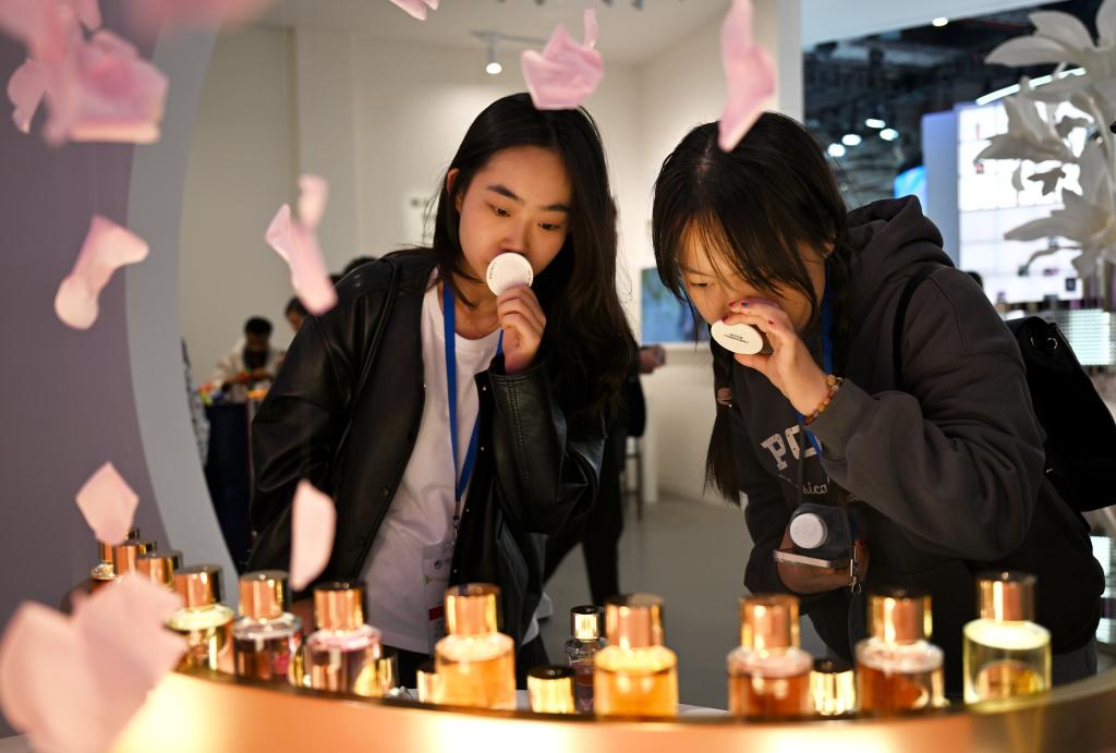 11月9日,觀眾在第七屆進(jìn)博會(huì)歐萊雅展臺(tái)試聞香水。歐萊雅是進(jìn)博會(huì)七屆“全勤生”。新華社發(fā)(陳浩明 攝)