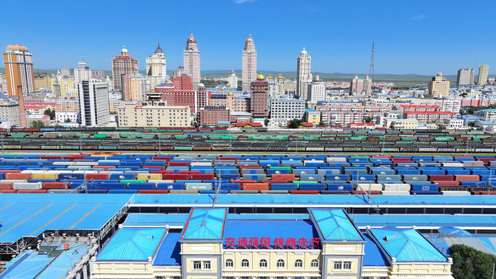 2024年8月20日,出境的中歐班列在中國鐵路哈爾濱局集團(tuán)有限公司內(nèi)蒙古滿洲里站內(nèi)整裝待發(fā)(無人機(jī)照片)。新華社發(fā)(黃旭 攝)