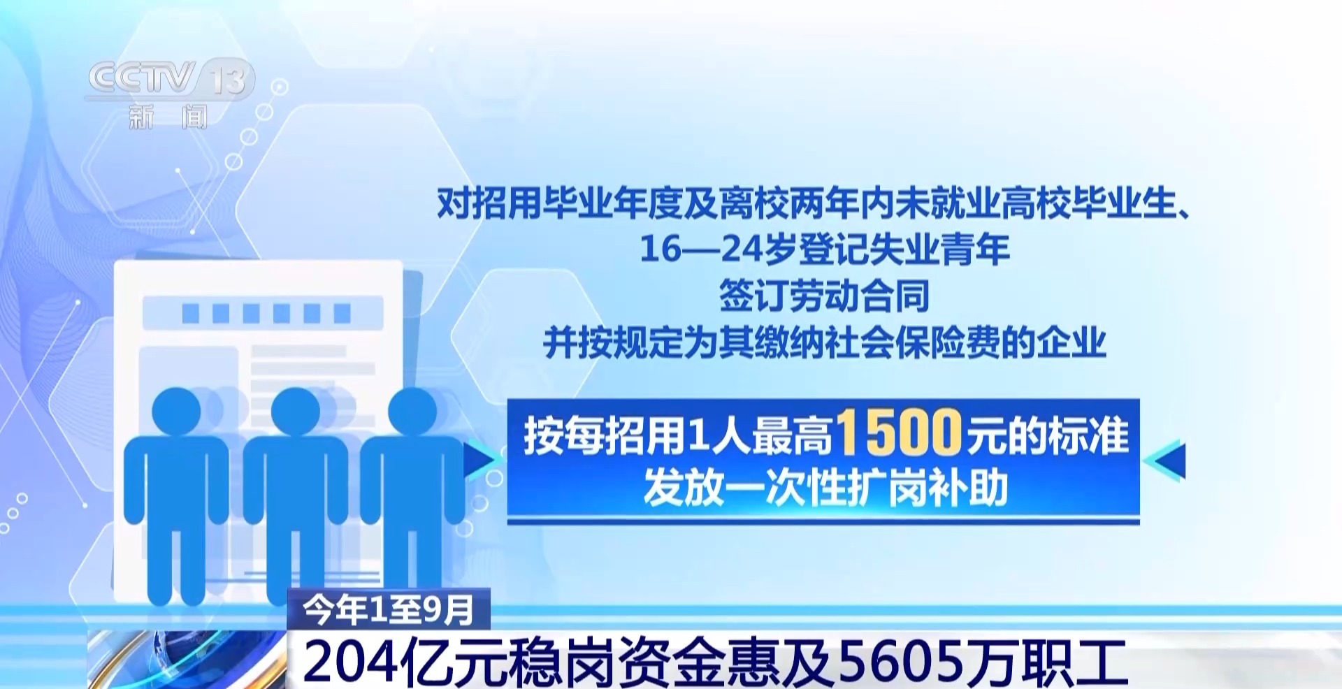對招用畢業(yè)年度及離校兩年內(nèi)未就業(yè)高校畢業(yè)生、16到24歲登記失業(yè)青年,簽訂勞動(dòng)合同,并按規(guī)定為其繳納社會(huì)保險(xiǎn)費(fèi)的企業(yè),按每招用1人最高1500元的標(biāo)準(zhǔn)發(fā)放一次性擴(kuò)崗補(bǔ)助,今年以來已向17萬戶企業(yè)發(fā)放9億元,惠及62萬高校畢業(yè)生等青年群體。