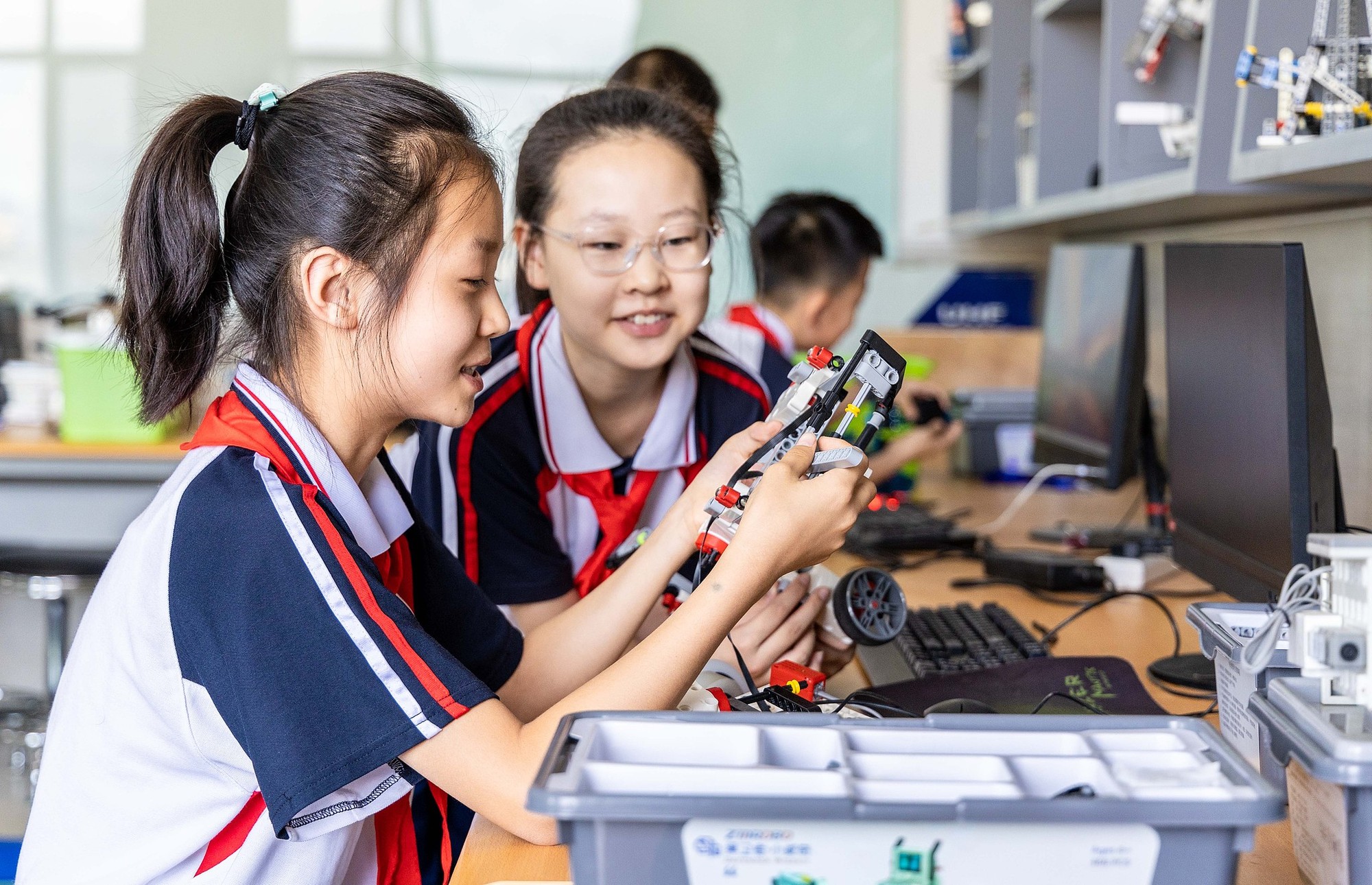 學(xué)生在人工智能科普課堂上組裝機(jī)器人