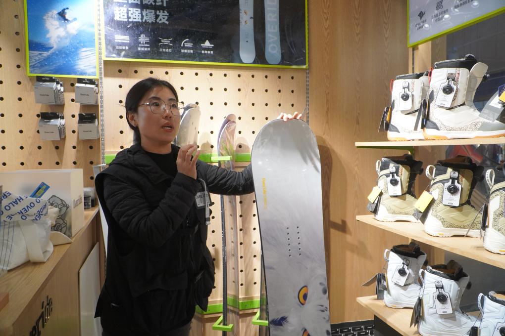 位于吉林省北大湖滑雪度假區(qū)的國產滑雪裝備品牌Overide門店內,店長賈曉娜在介紹滑雪板性能。新華社記者孫逸軒 攝