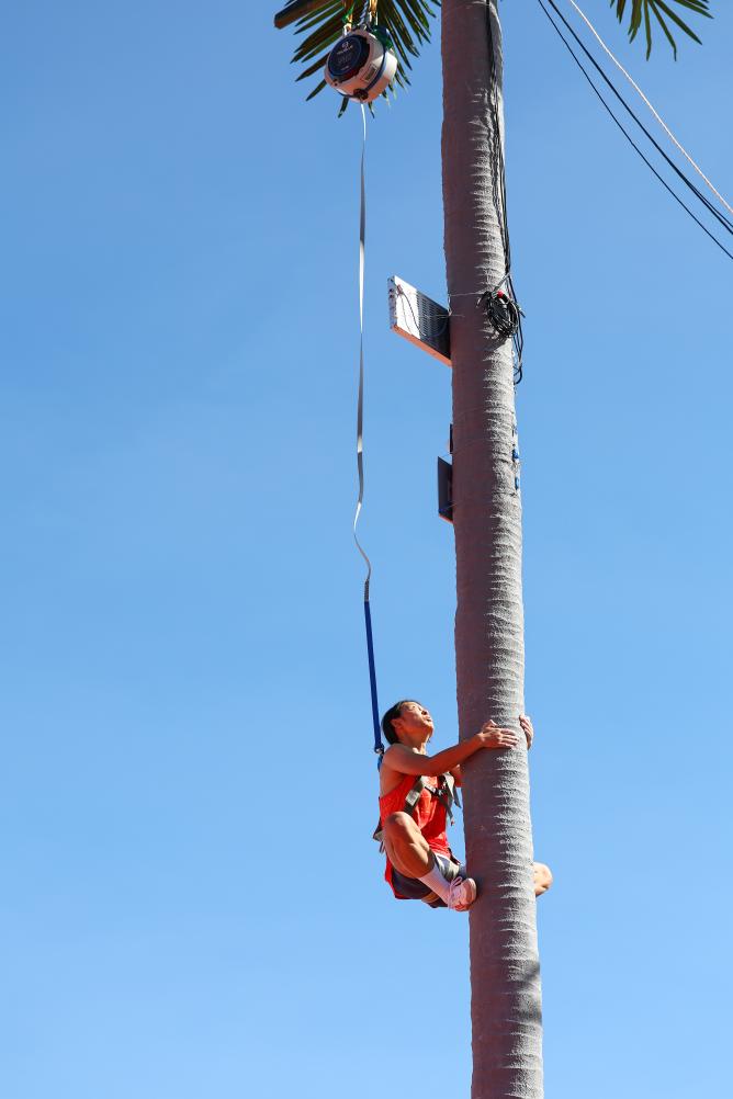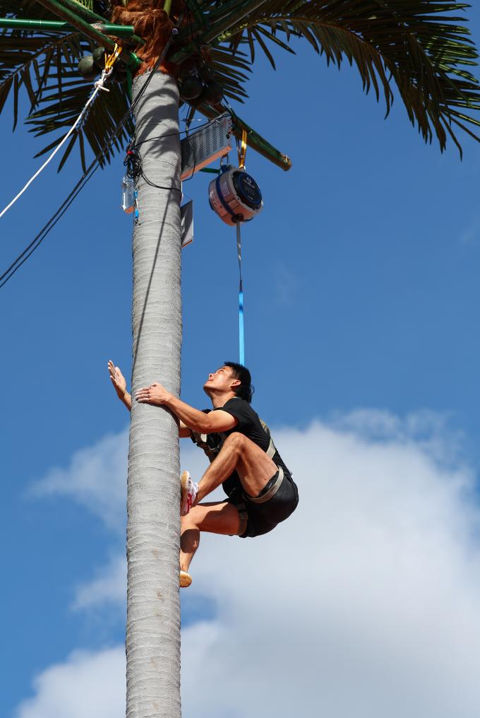 這項(xiàng)起源于海南群眾摘椰勞作的比賽既像沒(méi)有巖點(diǎn)的速度攀巖,又像垂直騰躍的跑酷。比賽中,運(yùn)動(dòng)員在9米(女子7米)的人造椰樹上攀爬,“樹干”筆直,六七秒之間便已決出勝負(fù),扣人心弦的比賽令觀眾發(fā)出潮水般的歡呼。
