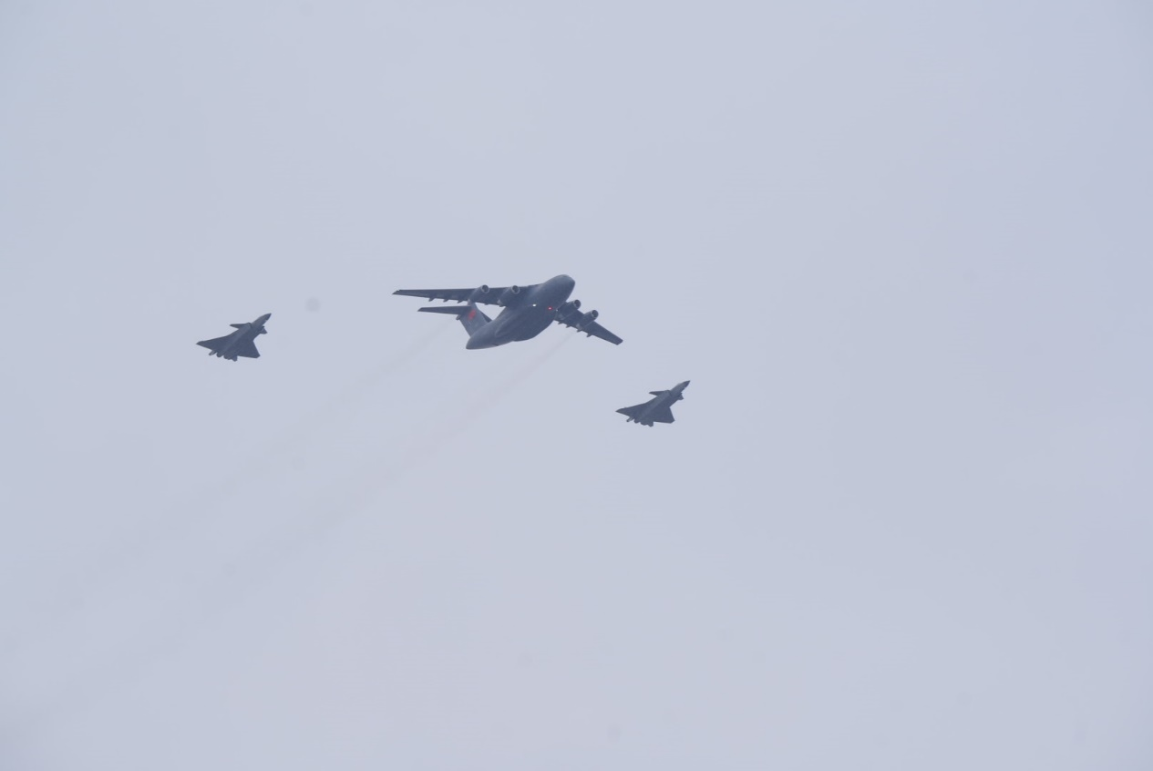 2023年,第十批在韓中國人民志愿軍烈士遺骸回國,“運-20”和兩架護(hù)航飛機(jī)“殲-20”。人民網(wǎng)記者 邱宇哲攝