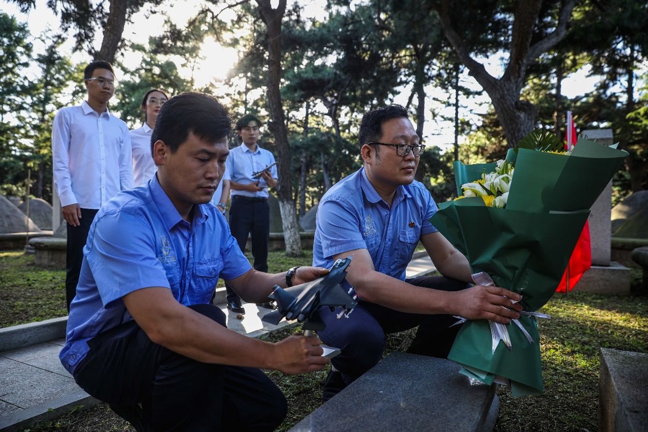 身穿“航空藍(lán)”的方文墨為志愿軍空軍烈士孫生祿敬獻(xiàn)花束,并將他的墓碑擦拭干凈。隨后,將一架沈飛生產(chǎn)的先進(jìn)隱身戰(zhàn)機(jī)“鶻鷹”的模型放在墓前?!拔覀円舆^英雄的接力棒,把祖國建設(shè)得越來越好!”方文墨說。