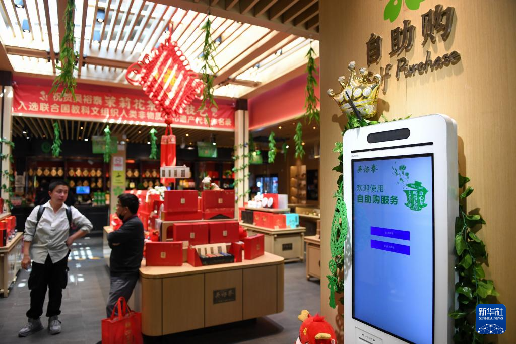 在吳裕泰北新橋總店內(nèi)設(shè)置的自助購(4月16日攝)。新華社記者 鞠煥宗 攝