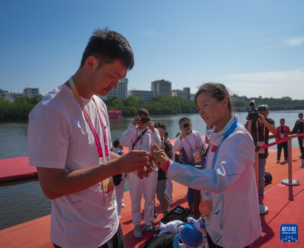 11月28日,何國潤(右)的男朋友向她求婚。當(dāng)日,在海南省三亞市舉行的第十二屆全國少數(shù)民族傳統(tǒng)體育運動會獨竹漂女子組200米直道賽頒獎儀式后,海南隊選手何國潤的男朋友在頒獎儀式現(xiàn)場向她求婚,上演溫情一幕。新華社發(fā)(杜笑微 攝)