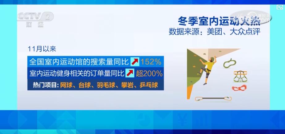 數(shù)據(jù)顯示,11月以來,全國室內(nèi)運(yùn)動館的搜索量同比增長152%,與室內(nèi)運(yùn)動健身相關(guān)的訂單量同比增長超200%,網(wǎng)球、臺球、羽毛球、攀巖、乒乓球是其中的熱門項目。