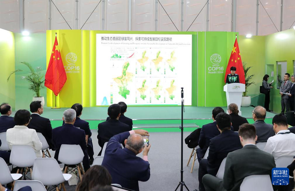 這是12月4日在沙特阿拉伯利雅得《聯(lián)合國防治荒漠化公約》第十六次締約方大會(COP16)中國館拍攝的邊會現(xiàn)場?!堵?lián)合國防治荒漠化公約》第十六次締約方大會(COP16)中國館4日下午舉辦首場邊會,向全球介紹荒漠化防治的“寧夏經(jīng)驗(yàn)”。新華社記者 王東震 攝