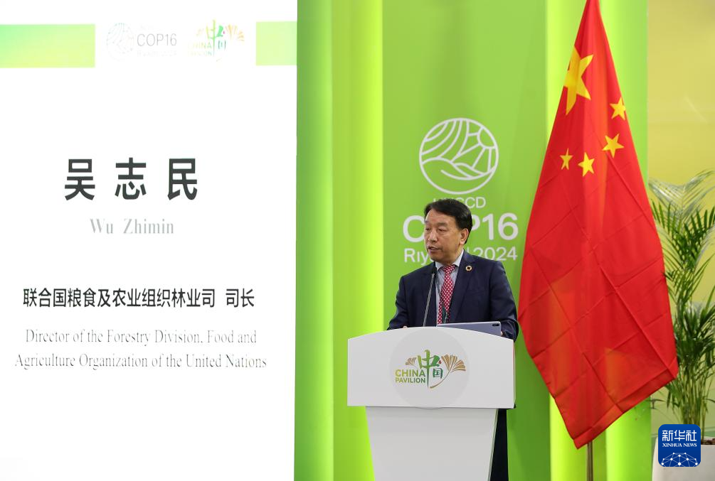12月4日,在沙特阿拉伯利雅得,聯(lián)合國糧食及農(nóng)業(yè)組織林業(yè)司司長吳志民在《聯(lián)合國防治荒漠化公約》第十六次締約方大會(COP16)中國館舉辦的邊會上發(fā)言。新華社記者 王東震 攝
