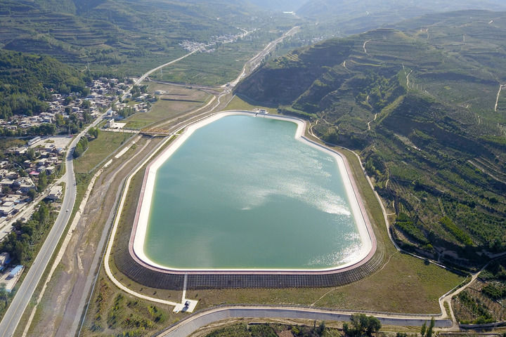 在甘肅省天水市拍攝的引洮供水工程楊家灣調(diào)蓄水池(2021年9月8日攝,無人機照片)。
