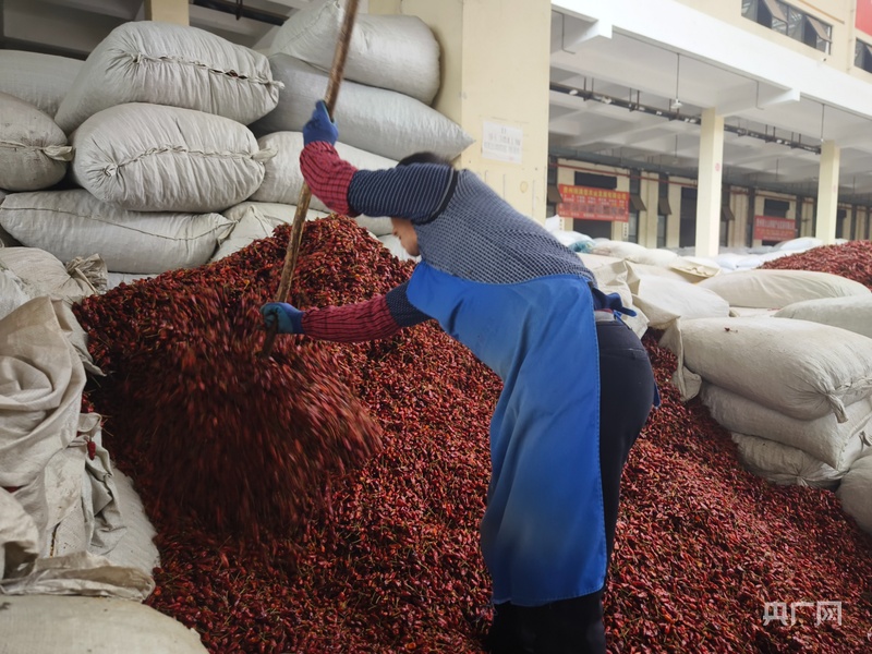 工人正在對辣椒進(jìn)行堆積,等待分裝(央廣網(wǎng)記者 欒小琳 攝)