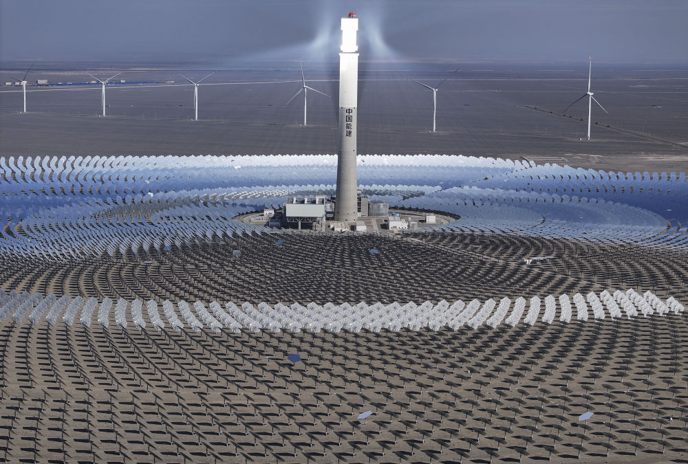 這是2024年9月12日在新疆哈密市伊吾縣淖毛湖鎮(zhèn)拍攝的國家光熱示范項目——熔鹽塔式50兆瓦光熱發(fā)電站(無人機照片)。新華社記者 胡虎虎 攝