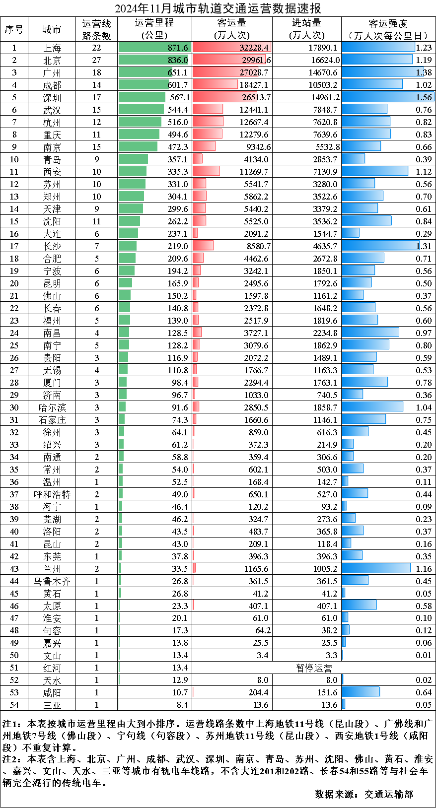 交通運輸部發(fā)布消息,2024年11月,31個?。ㄗ灾螀^(qū)、直轄市)和新疆生產(chǎn)建設(shè)兵團(tuán)共有54個城市開通運營城市軌道交通線路313條,運營里程10522.1公里,實際開行列車340萬列次,完成客運量27.1億人次,進(jìn)站量16.2億人次。11月份,客運量環(huán)比減少0.6億人次,降低2.2%,同比增加1.3億人次,增長5.2%。11月份全國總運營里程的平均客運強(qiáng)度為0.860萬人次每公里日,環(huán)比增長0.8%,同比增長1.9%。