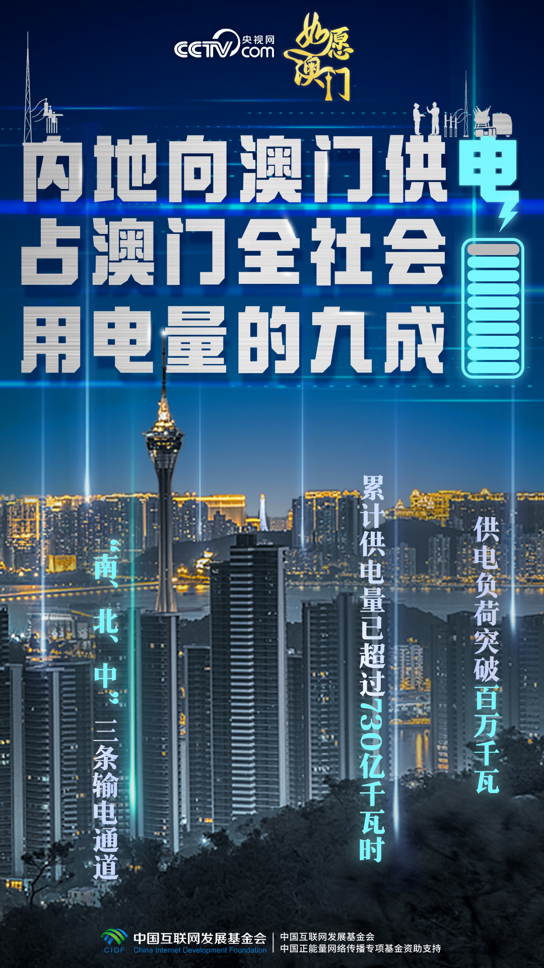 澳門缺電,南海油氣田里伸出專供澳門發(fā)電的天然氣管道,粵澳“南、北、中”三條輸電通道接續(xù)架設(shè),條條“銀線”相連,為澳門經(jīng)濟(jì)社會(huì)發(fā)展注入源源不斷的強(qiáng)勁動(dòng)能。1999年回歸當(dāng)年,內(nèi)地對(duì)澳供電量為1.95億千瓦時(shí);2024年7月,內(nèi)地向澳門供電負(fù)荷突破百萬千瓦,累計(jì)供電量已超過730億千瓦時(shí)。