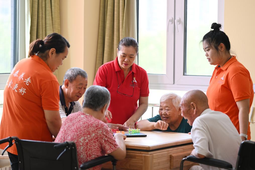 老人們?cè)谔旖蛭髑鄥^(qū)第一養(yǎng)老院的棋牌室內(nèi)活動(dòng)。新華社記者李然 攝