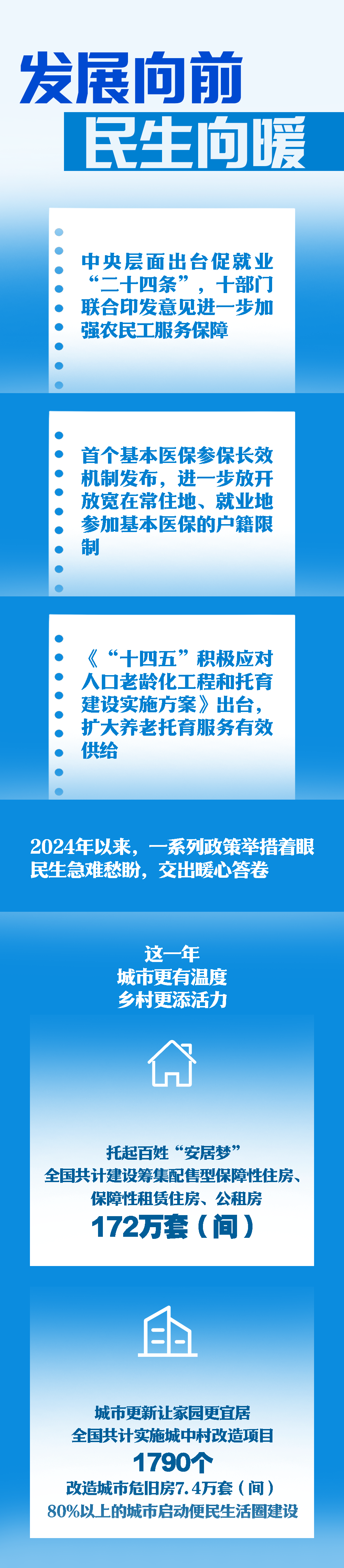 2024年以來(lái),從中央層面出臺(tái)促就業(yè)“二十四條”,到首個(gè)基本醫(yī)保參保長(zhǎng)效機(jī)制發(fā)布,再到聚焦“一老一小”領(lǐng)域擴(kuò)大養(yǎng)老托育服務(wù)有效供給,一系列政策舉措著眼民生急難愁盼,書(shū)寫(xiě)暖心答卷。