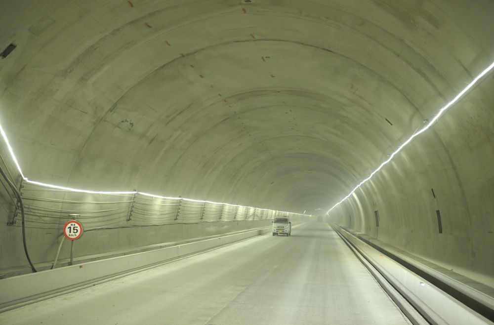 這是一次前所未有的駕駛體驗(yàn),隧道足可容納兩車并行,路面平坦。隧道內(nèi)部,LED燈帶照亮前路,去除幾分幽深神秘。每隔百米左右,就有通向中導(dǎo)洞的通道,遇到施工堵路,也可以很快調(diào)整路線。