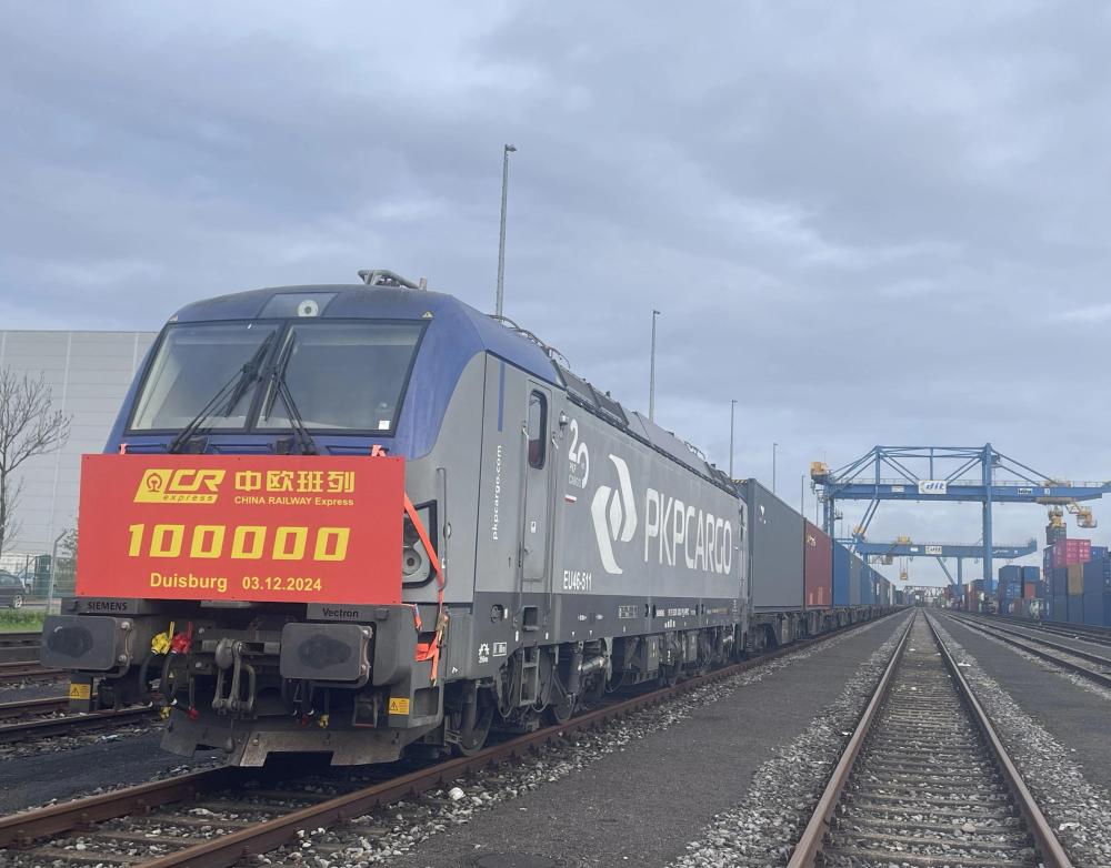 這是2024年12月3日在德國杜伊斯堡市DIT場(chǎng)站拍攝的第10萬列中歐班列。新華社 朱璇 攝