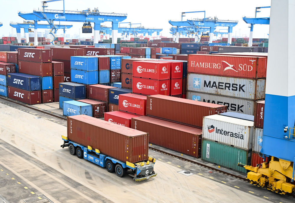2024年10月20日,在廣西北部灣港欽州港區(qū)碼頭,一輛自動(dòng)化無人轉(zhuǎn)運(yùn)車在運(yùn)送集裝箱。各式各樣運(yùn)往東盟各國的貨物在這個(gè)海鐵聯(lián)運(yùn)自動(dòng)化集裝箱碼頭實(shí)現(xiàn)“下船即上車、下車即上船”。新華社記者李賀攝