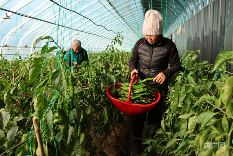 蘇家堡村的蔬菜大棚里,工人們正在摘螺絲椒(央廣網發(fā) 胡建華 攝)
