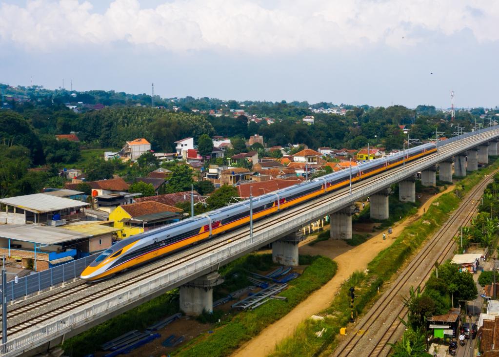 這是2023年5月22日拍攝的行駛在印度尼西亞雅萬高鐵沿線的雅萬高鐵綜合檢測列車(無人機(jī)照片)。新華社發(fā)(中國鐵路國際有限公司供圖)