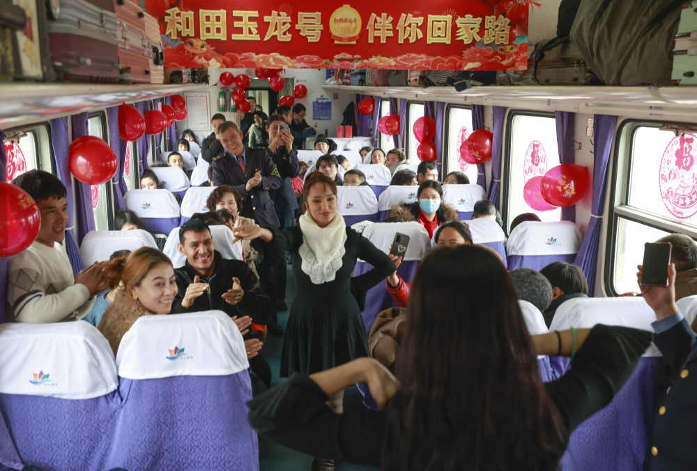 在7557次列車上,旅客隨音樂(lè)跳起麥西來(lái)甫。新華社記者 王菲 攝