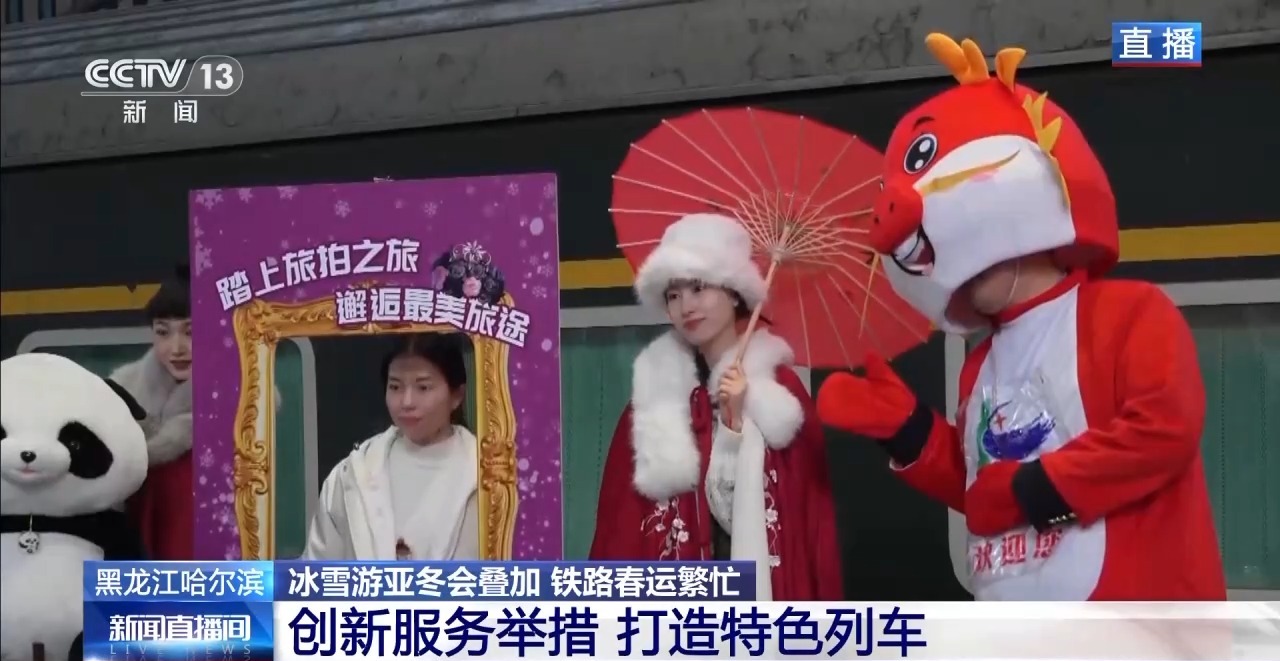 在春運(yùn)期間,鐵路部門(mén)還打造了特色主題列車(chē),比如現(xiàn)在已經(jīng)開(kāi)通的“旅拍列車(chē)”。車(chē)上設(shè)置了哈爾濱街景、民俗文化、冰雪奇遇等主題場(chǎng)景,車(chē)上還有化妝間、更衣室,可以為旅客提供多種風(fēng)格的旅拍服飾,旅客可以通過(guò)手機(jī)小程序進(jìn)行預(yù)約。拍攝人員也是由愛(ài)好攝影的鐵路職工組成的旅拍團(tuán)隊(duì),大家都是利用業(yè)余時(shí)間為旅客免費(fèi)提供服務(wù)。
