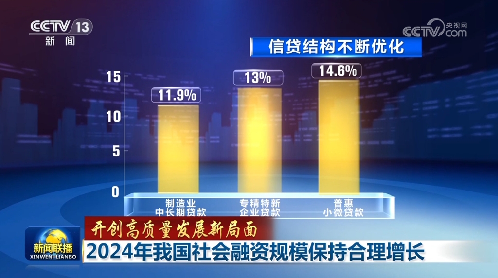 中國人民銀行相關(guān)負(fù)責(zé)人介紹,2024年12月末,社會(huì)融資規(guī)模存量為408.34萬億元,其中,對(duì)實(shí)體經(jīng)濟(jì)發(fā)放的人民幣貸款余額為252.53萬億元,同比增長7.2%。信貸結(jié)構(gòu)不斷優(yōu)化,制造業(yè)中長期貸款、專精特新企業(yè)貸款、普惠小微貸款增長較快,繼續(xù)高于同期全部貸款增速。