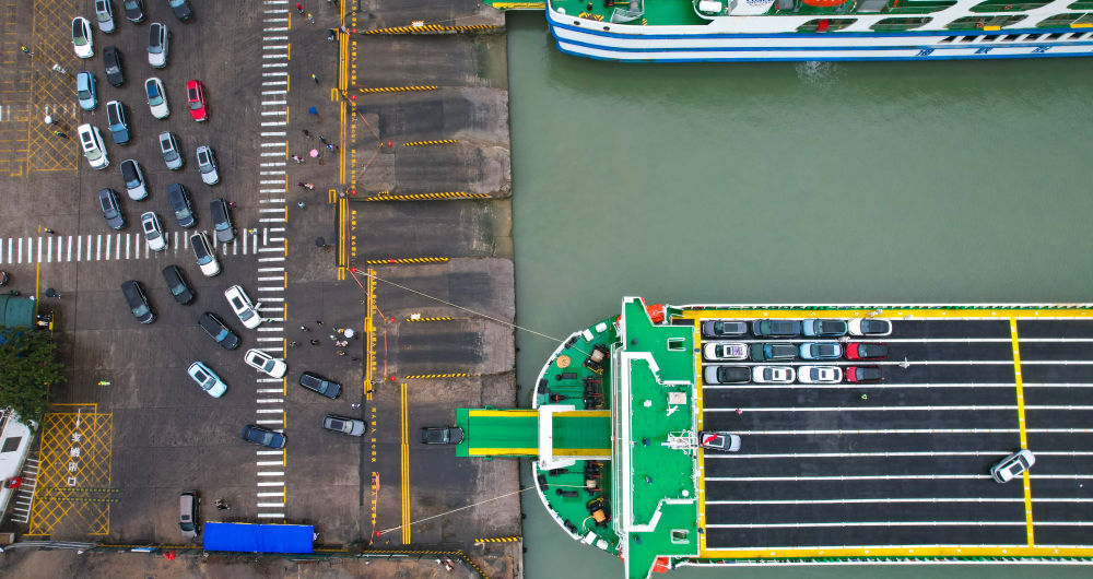 1月14日,在海南省??谑行阌⒏?,新能源車(chē)排隊(duì)駛?cè)胄履茉窜?chē)專(zhuān)用運(yùn)輸船“綠源二號(hào)”(無(wú)人機(jī)照片)。(新華社記者 楊冠宇 攝)