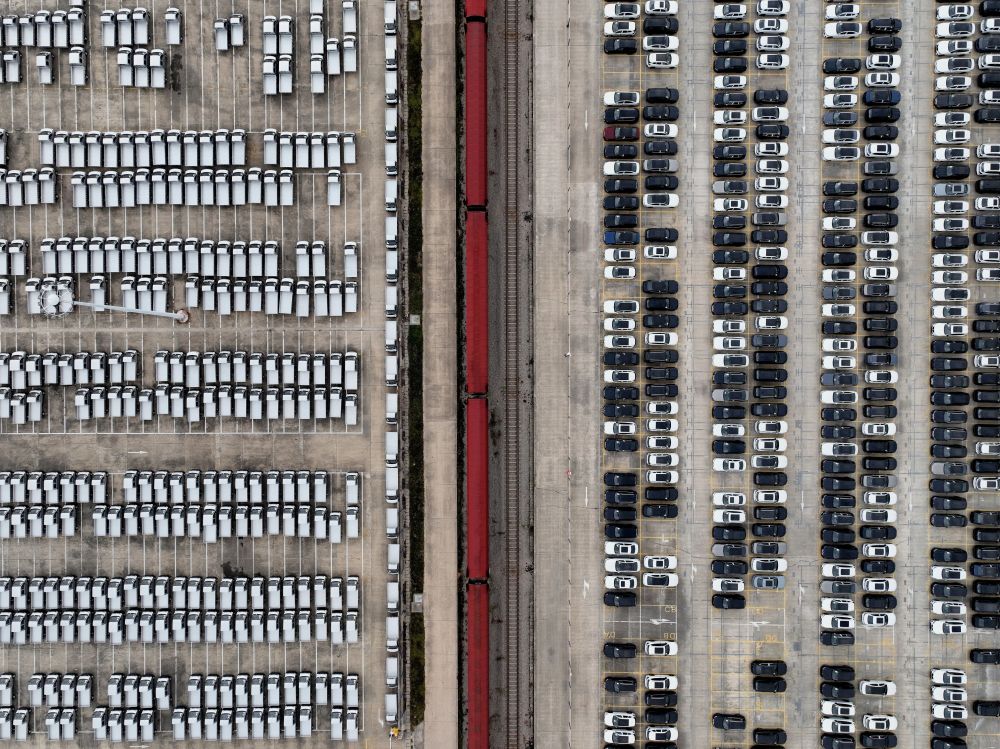 這是在中鐵聯(lián)集武漢中心站拍攝的整裝待發(fā)的汽車(2024年11月16日攝,無人機照片)。新華社記者 邢廣利 攝